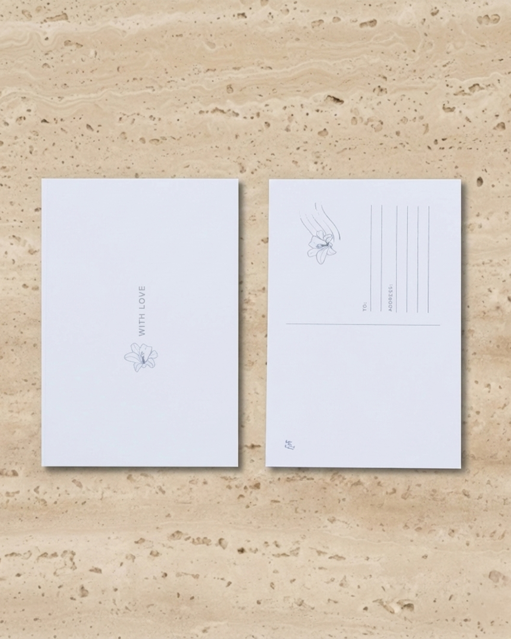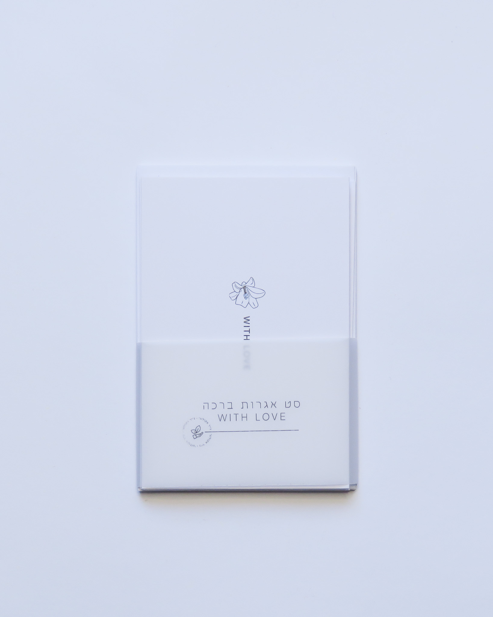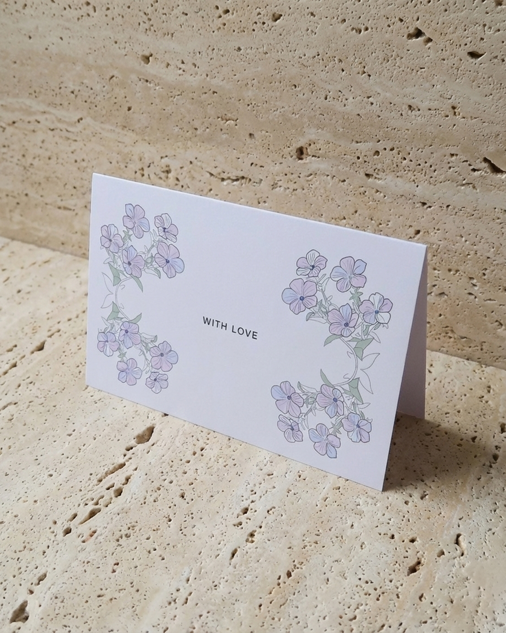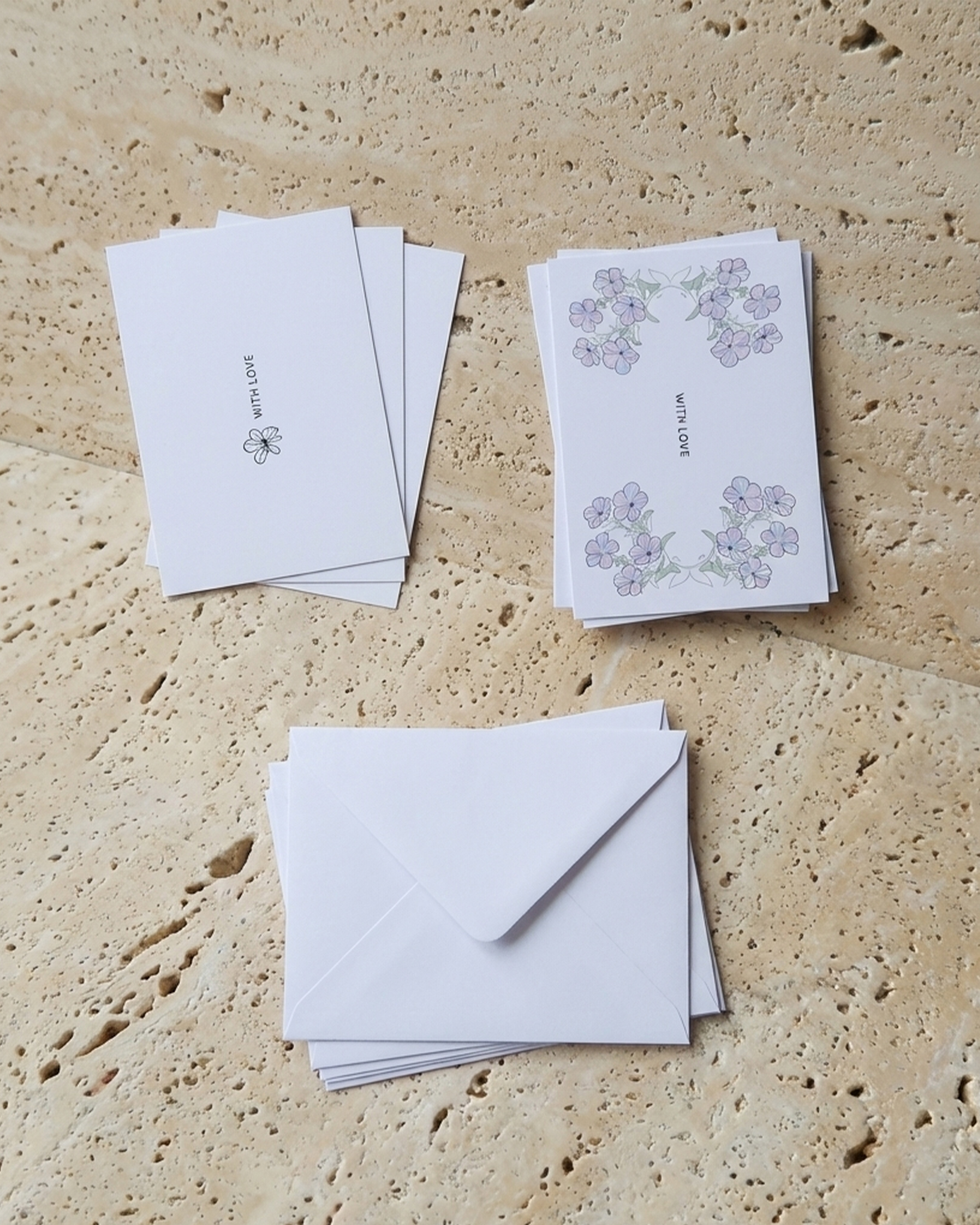 סט כרטיסי ברכה With Love נוצר מאיורים דיגיטליים מקוריים, בעיצוב פרחי פשתה ושושן צחור.