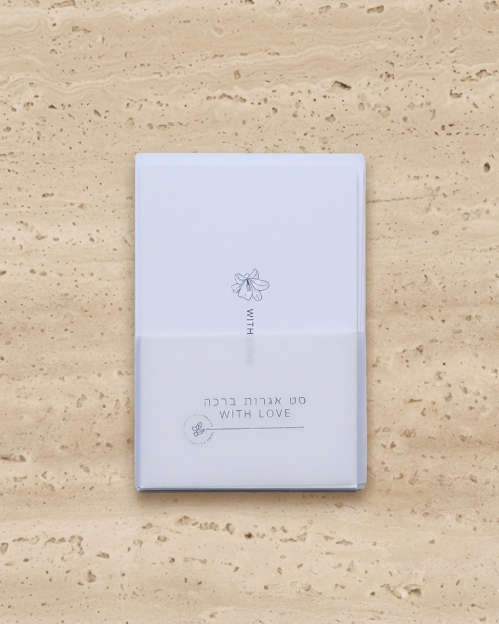 הסט כולל 4 כרטיסי ברכה, 4 גלויות מעוצבות ו- 8 מעטפות: