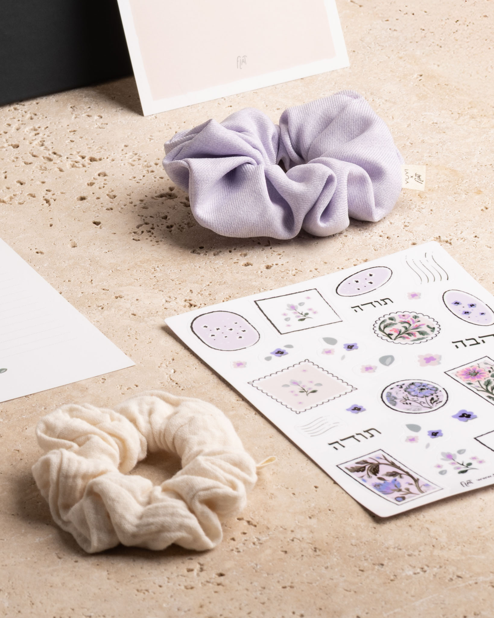 תכולת הסט: 2 יחידות סקראנצ'י, בצבע לילך רך ושמנת טבעית.