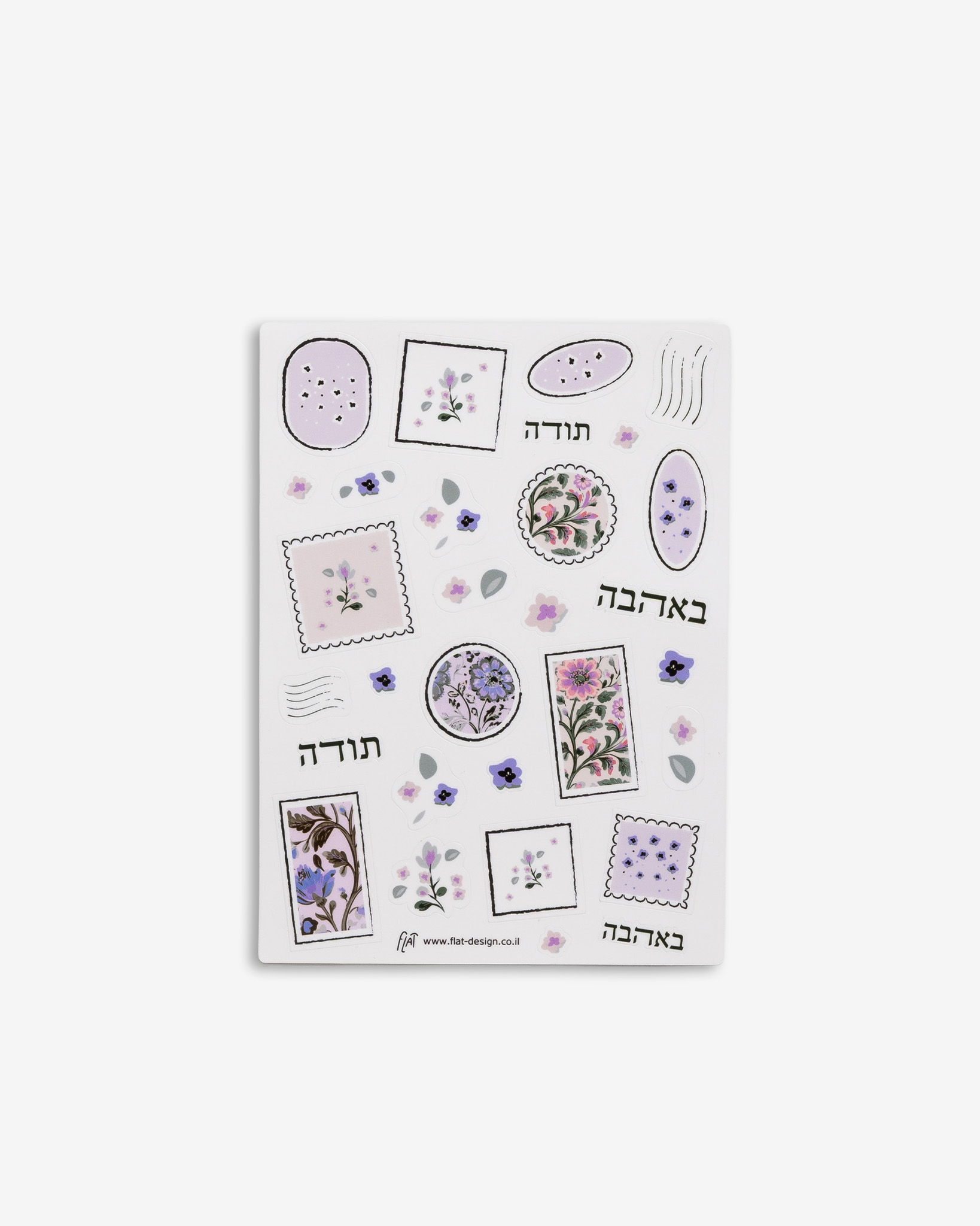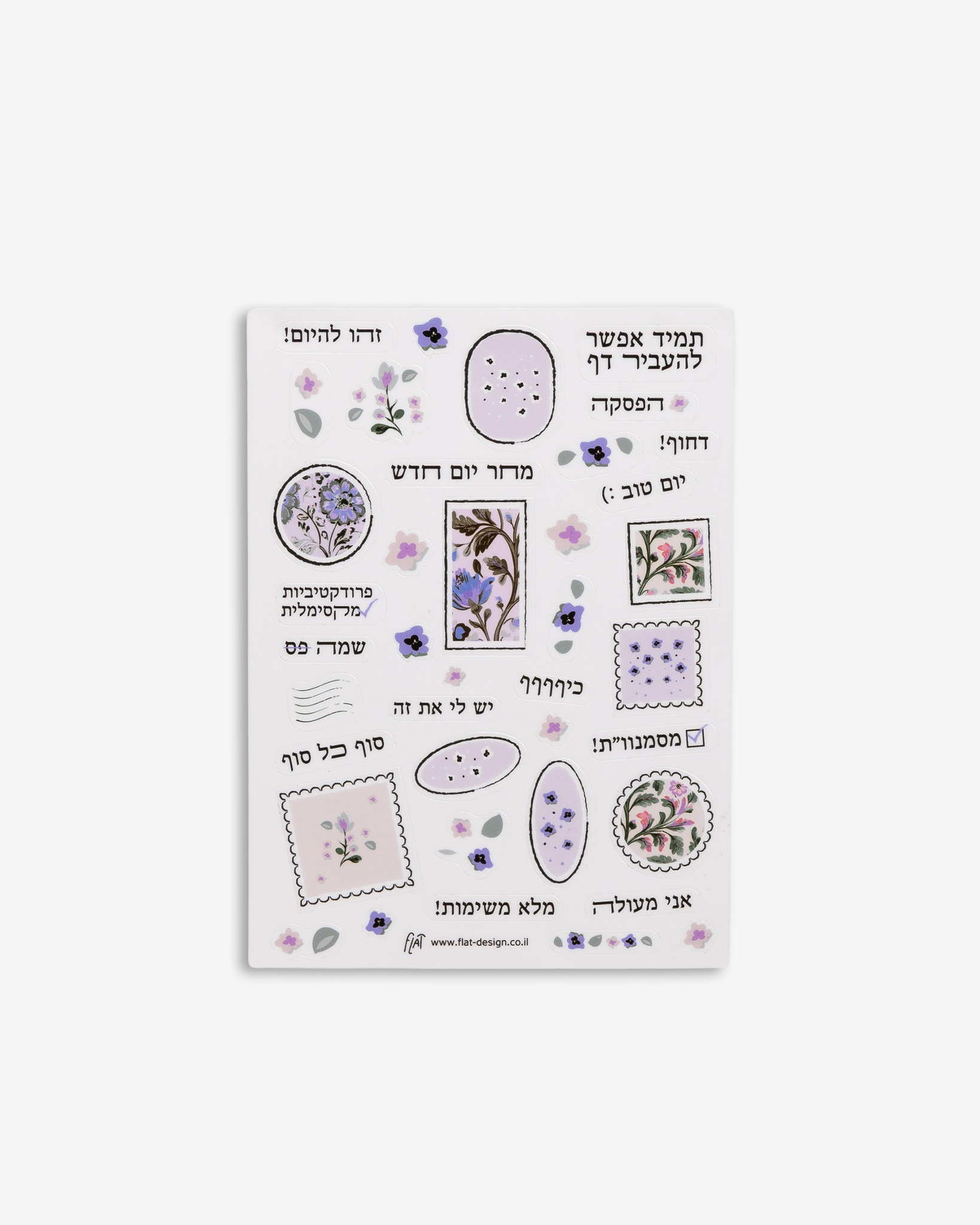 הסט כולל שני דפי מדבקות: הראשון עם כ־40 מדבקות של מילות עידוד לעצמך המתאימות ליום עבודה, והשני עם כ־30 מדבקות של פרחים, בולים ומילות תודה.